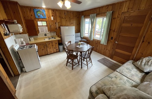 This cabin is located at Green Valley Resort on Seventh Crow Wing Lake. It has a lake view, open kitchen and living area with a sofa, large shower, window A/C and ceiling fans. It is the cabin closest to the lodge and lake, sits up higher, and is well shaded. Our on-site lodge has books, games, and snacks; dock space for your boat; and boats for rent too. Come enjoy beautiful sunsets, great fishing, and relaxing in nature at our family-friendly fishing resort! We hope to see you soon!