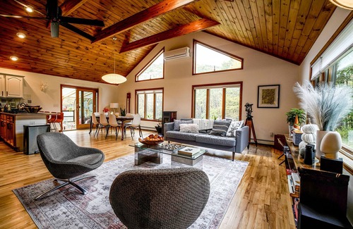 This beautiful Cabin is located on 15 private acres outside of Walton, New York just a 2h 30 min drive away from George Washington Bridge. Perfectly tucked away and surrounded by woods in the Western Catskills you will find this recently updated gem featuring vaulted beamed ceilings, big windows and skylights, wood-pellet stove and many modern amenities.