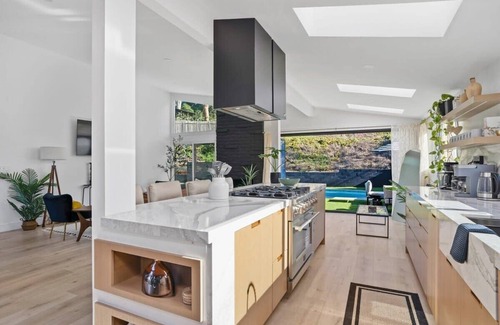 As you enter, you will cross the threshold into the living room with a view of the outdoor living area and pool. The massive kitchen/dining area is just to your right. There are 3 bedrooms and 2 full baths in the main house. The ADU welcomes you to an additional bedroom, kitchen, bath and living room with a queen sofa bed. There’s a laundry room if you need and free parking (2 or maybe 3 smaller cars on the driveway and free street parking)