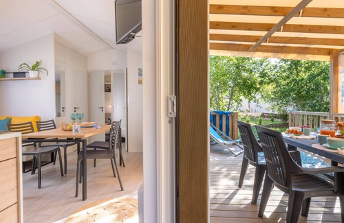 Surrounded by lush greenery, our eco-friendly camping offers a peaceful setting in Vendée. Hikes and bike trails are available right outside the camping for beginners and experienced hikers alike. In the summer, our fun animations and exciting themed nights are organized. There is also a water park, a kids club and a bike rental on-site. Fully equipped, our modern 3-bedroom mobile home is perfect for a comfortable holiday in the countryside!