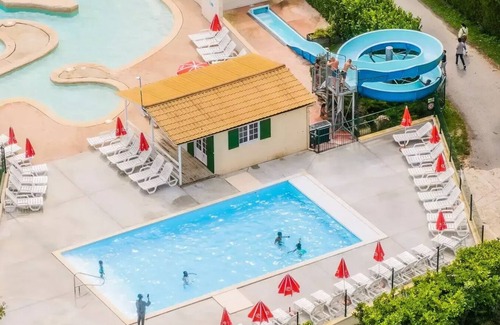 Dogs of the molossoid family : Prohibited Barbecue : Barbecue on feet with charcoal, proposed for sale: 17 €/barbecue (subject to fire risk restrictions). Ground lights and personal BBQs/planchas are prohibited. Deposit (in supplement) : 300 Wellness area : outdoor fitness machines Final cleaning fee : 100€/housing (on reservation upon arrival, subject to availability). If you do not agree with this cleaning option, you should return the accommodation in a good condition of general cleanliness (including cleaning of the plancha), according to the guidelines set out in the camping rules of procedure. Baby Kit : (Cot umbrella without mattress + high chair) 6€/day or 42€/week (upon reservation and subject to confirmation by the campsite) Laundromat : washing machine 4,50 €/jeton - dryer 4 €/jeton - laundry dosette : 1 €. Let's go to the reception for sale. Bedding : Kit Sheets (single-use, disposable sheets) : 7€/single bed - 9€/double bed depending on availability and reservation - to be paid on site Number of stars : 4 Water park : Aquatic area: from 1/05 to mid-September, subject to good climatic conditions. From 10am to 7pm in low season (8pm in July/August).
