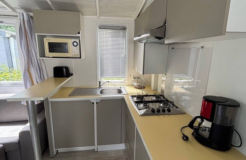 Guest accommodations at Camping La Tentation - Mobil-home Endives offer coffee/tea makers. Rooms open to patios. Accommodations are furnished with dining tables and kitchen islands. Kitchens offer refrigerators, stovetops, microwaves, and separate dining areas. Bathrooms include showers. Housekeeping is provided on request.