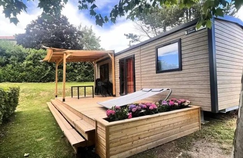 Accommodation: Charming 2-bedroom chalet (26m2) for up to 4 people. 1 double bedroom, 1 bedroom 2 single beds, living room, equipped kitchen (dishwasher, refrigerator, hob, microwave), bathroom and separate toilet.