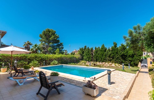 Large, cosy single-family house "Cap Blanc", 2 storeys. 400 m from the centre of Sa Torre, 16 km from the centre of Llucmayor, 50 km from the centre of Manacor, in a quiet, sunny position residential area (villas), 200 m from the sea. Private: property 1'000 m2 (fenced), garden with lawn and wildlife garden, swimming pool (9 x 5 m, seasonal availability: 01.Jan. - 31.Dec.). Patio, pergola, garden furniture, pool maintenance by the owner/gardener. In the house: internet access, WiFi, storage room for bicycles, air conditioning, washing machine. Stepped path (2 steps) to the house. Parking, public parking on the road. Supermarket 2 km, restaurant 400 m, bus stop 750 m, sandy beach "Playa de Palma" 16 km, rocky beach "Maioris" 2.5 km. Golf course (18 hole) 2 km. Please note: car recommended. Suitable for families. Object suitable for 6 adults. The owner does not accept any groups. The owner does not accept any youth groups. Airfield 25 km from the property. Neighbourhood highly sensitive to noise. Quietness and good behaviour expected.