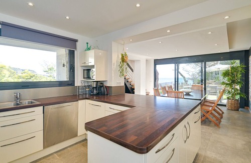 This beautiful semi-detached house is nestled in the picturesque bay of Cala Salions, in the heart of the Costa Brava, offering an exceptional location just 100 meters from the beach. Its privileged position, almost directly above the sea, provides breathtaking views and the soothing sound of the waves.LOCATION:The beach is just a 3-minute walk away, accessible via a convenient stairway that leads directly from the street to the sand—perfect for spontaneous dips in the Mediterranean.HOUSE LAYOUT:The house is spread over three spacious floors, designed for comfort and relaxation:GROUND FLOORA modern, fully equipped open-plan kitchen with a dining area.Large sliding doors open to the garden/terrace, featuring outdoor dining furniture, a grill, and spectacular sea views—perfect for al fresco dining.On this floor there are two double bedrooms, each with a double bed.One bathroom with a shower.FIRST FLOORA bright, open-concept living area with cozy sofa, a TV, and a foosball table—the perfect spot to unwind.One double bedroom with a private balcony.A second double bedroom with a double bed.A second bathroom with a shower.TOP FLOORTwo double bedrooms.A spacious kids’ room with 5 single beds.A third bathroom with a shower and a separate toilet.AMENITIES- Free Wi-Fi.- Air conditioning in all rooms.NEARBY BEACH & ATTRACTIONSThe beautiful Cala Salions is located right next to the house, just cross the street and walk down the stairways and you'll be on the beach!In high season there's also a small supermarket at walking distance, with daily fresh bread and croissants, ideal! Other must-visit beaches nearby include Cala Giverola, Cala Pola, and all beaches between Tossa de Mar and Blanes. The charming town of Tossa de Mar is just 8 km away. Known for its beautiful beaches, medieval old town, and relaxed atmosphere, it’s a family-friendly destination with a wide range of watersports, excellent restaurants, from cozy tapas bars to fresh seafood spots.Scenic coastal walks and cultural sites to explore!Inside the villa, you’ll find a booklet with our personal recommendations and hotspots to make the most of your stay!GOOD TO KNOW- A set of bath towels per person is included.- Unfortunately we do not accept groups of youngsters in this villa. The minimum age for guests is 28 years old. Families with children are more than welcome!