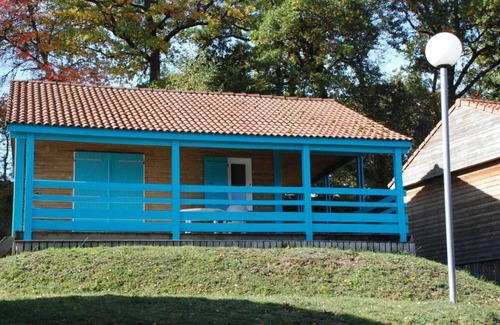 This chalet features a private covered terrace. Additionally, there is a shared outdoor area with a fenced pool (open from 9 am to 7 pm, May 1 to September 30), garden, children's pool, barbecue, playground, and outdoor shower.