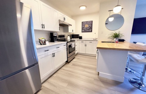 This newly designed 1-bedroom suite prioritizes comfort and privacy. It comes equipped with amenities such as in-suite laundry, a Douglas queen bed, and a walk-in shower stocked with quality essentials. The full kitchen has everything you need to prepare your favorite meals, while the roomy sectional sofa provides a cozy spot to lounge and stream Netflix, Crave, Disney+, and Prime Video. Fast, secure Wi-Fi ensures a relaxing stay.