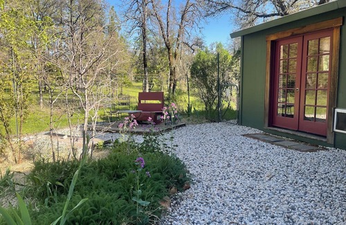Relax and unwind at this tranquil and private Sierra Foothill cabin in the forest. Landscaped and fenced in back yard with patio with a private view of pristine forest. Cozy, clean and comfortable place to work, relax or enjoy the best of Nevada County's beauty. 15 minutes from historic downtown Nevada city and Grass Valley. 22 minutes from the gorgeous Yuba River 49 crossing. Couch can covert to second bed. Air mattress available upon request. Quiet and traffic free. Wifi, AC & Wood stove.