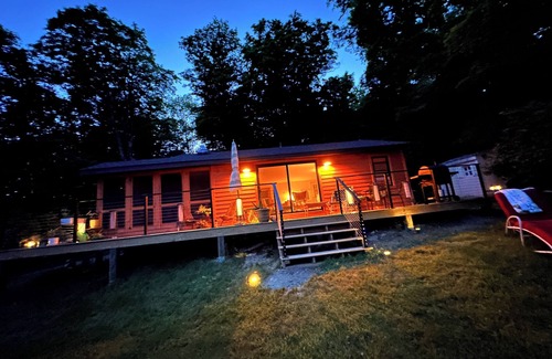 5 acres & a newly renovated 1 bed/1 bath cabin with a huge deck & screened porch overlooking a large pond. All you hear are bullfrogs, birds, train. Sleeps 4 with a full bed & queen pullout couch. Full kitchen has everything you need. There’s a charcoal bbq, 2 Midea AC units, Apple TV, Bluetooth sound bar, etc. Perfect if you need to write a book or just get away from it all. Great forest walks & trails surround the property. Pass to the members only swimming beach on nearby Queechy Lake available!