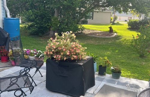 Three town squares have live bands and dancing every night. Three grocery stores are just 5 minutes away, plus major brand big box stores. Relax on the patio with a hot tub, grill, fire pit, and dining table in a peaceful, park-like setting. (There’s also an indoor sauna in the guest bedroom.) Or unwind with a cup of tea or glass of wine in the front screened-in area.