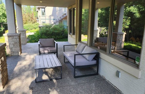 Escape to this charming house in picturesque Calgary. Surrounded by hiking trails in fish creek park and private outside seating area with a putting green. This cozy retreat features 2 bedrooms with a queen and full bed, a well-equipped bathroom, and a lovely living room with a sofa bed. Guests can enjoy amenities like heating, hair dryer, and WiFi during their stay. Relax in the serene surroundings or take advantage of the fitness room. We look forward to hosting you at our place.