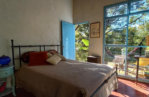 Our house is located in the midst of the forest, surrounded by Cerrado, where it's possible to spot birds, agoutis, and other wildlife. Ideal for couples, 2 friends, or solo travelers who want to enjoy nature with privacy and comfort. But more than that, here it's possible to feel rest, peace and connection. To top it off, we offer exclusive access to the São Miguel River, one of the cleanest and most beautiful rivers in Chapada dos Veadeiros. A true luxury.