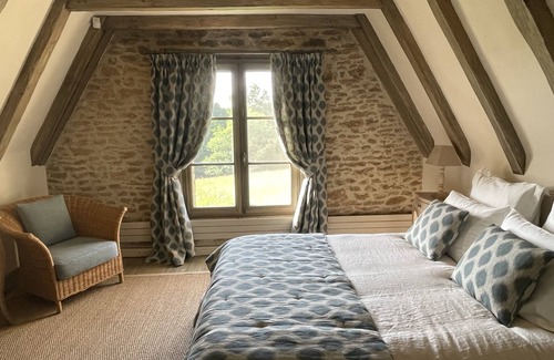 The interior includes walls of exposed stone and beamed ceilings. The main floor is comprised of an eat-in kitchen, a living room/dining room, a utility room, and a half-bath. The chef’s kitchen, recently totally remodeled, is of generous size and includes a wonderful Lacanche stove, a dishwasher, espresso maker and all you will need to prepare beautiful meals. From the kitchen table, a lovely stone window looks out into the meadow. The living room is large and includes a comfortable sitting area as well as a long farm table for dining. Upstairs, there are two bedrooms, one with a queen-sized bed and the other with two single beds that can be joined to make a king-sized bed. Both rooms have large, French casement windows, antique armoires, and generous dressers. The bathroom includes a tub and rain shower, a heated towel rack, and a sink set into a tile counter. The WC is separate. The house is equipped with central heating, a washing machine, and high-speed wireless internet access.