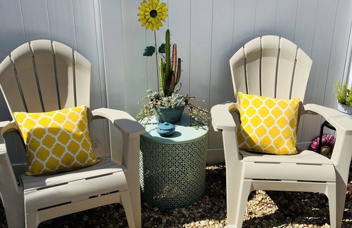 In addition to the inviting indoor space, this booking includes a private outside patio. Take a seat in one of the two Adirondack chairs shaded by an oversized umbrella. It's the perfect spot to relax with a good book, savor a glass of wine, or simply enjoy some music.