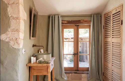 The second bedroom, with its beautiful stone walls, sage-green lime plaster and linen curtains hand-embroidered with khaki and celadon floral motifs, has a small bathroom with shower and Wc. It has 2 single beds.