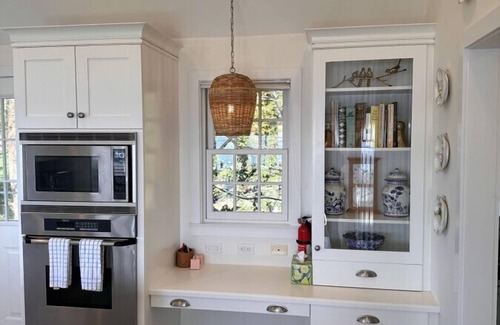 The Guest Cottage, which sits behind the main house and above the garage, has a bathroom with a shower and a kitchenette that includes a coffee maker, microwave, kitchen sink, and minifridge. There is a loft with mattresses (not included in sleeping capacity) accessible via a pull-down ladder. The Cottage could accommodate a couple or a family with young children and is furnished with a four-seat dining table and queen-sized sofa pullout. Moreover, there is a Pack ‘n Play in the closet. The doors in the living area open to a mini balcony. In addition, the cottage has two dedicated parking spaces, providing in and out access.