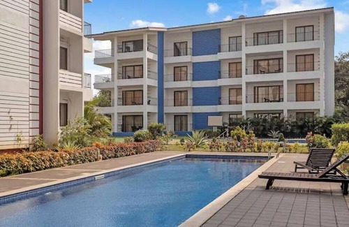 The complex also provides 2 large swimming pools, a jacuzzi pool, a gym, dedicated parking, and a stunning field view to kick back and enjoy the Goa skies in!