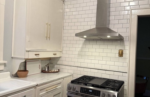 The kitchen features a huge farmhouse sink original to the house. The cabinets and layout of the kitchen are original too. Every utensil is available for your cooking adventures. The huge walk-in pantry includes spices and staples for your use. The kitchen is fully equipped for cooking and serving. Calphalon cookware is available so no sacrifices are made.