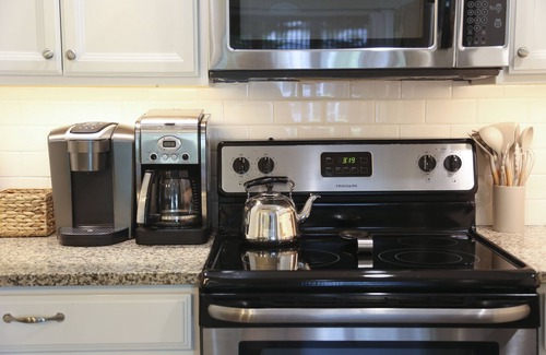 KITCHEN: Fully stocked with stainless appliances, granite counters, Ninja blender, toaster, chef grade knives, coffee/tea bar, etc