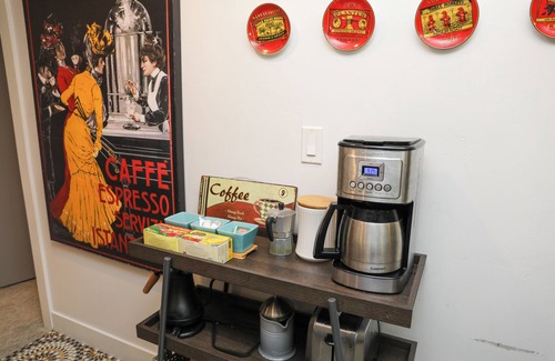 ♥ Kitchenette: A small kitchenette with essential amenities, including a sink, microwave, toaster, electric tea kettle, coffee station, small fridge, and a single countertop burner. Please note, there is no traditional stove, oven, or dishwasher.