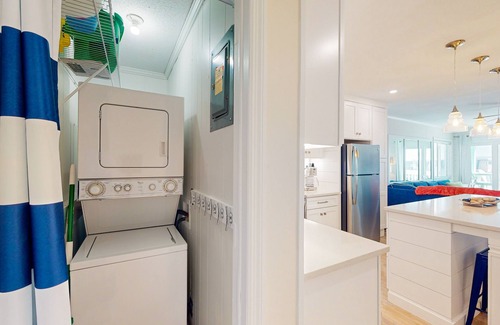 The bright new kitchen is a chef's dream, featuring an island that seats four, white Shaker cabinets, quartz countertops, mosaic tile backsplash, and wonderful lighting. As you sit at the island, you can even catch a glimpse of the ocean reflected in the mirror, adding a touch of magic to your dining experience.