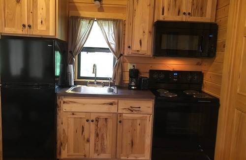Natural pine from floor to ceiling makes this cozy home a true log cabin. Lofted ceilings lend to an airy atmosphere in the great room featuring a small kitchen, and living and dining areas that seat 5. All guests can relax, dine and watch TV in the great room.