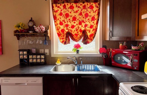 Tired of the plain jane hotel rooms, with noisy hallways, blah looking sheets and never enough pillows? Come on in to the Woodford Guest House. Drive in to Mckenzie Towne - a front porch European looking community. Park in your own parking pad & follow the red brick path to your own entrance. No walls or hallways to share with anyone else. Up the stairs you will find a fully furnished 1 bedroom apartment. Lots of bright colored towels, red curtains, fun bedding, LOTS of pillows, a colorful queen sized sofa bed, 7 windows to soak in the sun, laundry machine and soap so you can go home with clean clothes, and coffee, tea and hot chocolate to get you started. And don't forget the warm plate of fresh baking to greet you. Enjoy a leisurely 15 minute walk to our popular High Street, with shopping, coffee shops & pubs. Hop in your car, and in 20-30 minutes you will find shopping, Calgary Tower, Stampede grounds, Elbow Falls, the Zoo & more. Or venture out to the mountains for the day. Cost is $120 Canadian per night. Pets not allowed anymore due to damage unfortunately