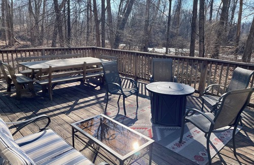 The outdoor space offers a spacious deck overlooking a babbling creek with a large outdoor dining table and a gas fire pit, and a fire ring within the garden grounds. Both areas are a great place to unwind after a day of exploring the area!