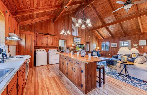 With a canal-front dock to tie up your watercraft after launching at a nearby marina and a yard the kids will love, the natural setting extends to the home’s interior, a wood-lined space designed for one-level living. Ceiling fans drop from the beamed vaulted ceiling to naturally cool the open floor plan comprising of a kitchen, dining area and great room. Four stools front a kitchen breakfast bar where, along with a six-seat dining table and a picnic table located on the wide deck, provide multiple options to enjoy meals together. There’s a large Smart TV in the great room, with plenty of ample seating to relax with your favorite shows. When the stars don’t align on what to watch, a separate den features another Smart TV or a quiet space to curl up with a good book. The home’s three bedrooms, all featuring Smart TVs, include a king master with ensuite bath, and a queen and a room with one double bed and a single bed that share a hallway bath that is also accessible from the den.