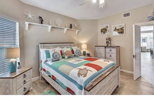 Bedroom 2: Cozy room with a beach-themed mural is bright and airy due to the multitude of windows. This room contains a comfortable full bed and a Smart TV. Plenty of storage available in the closet, dresser, and nightstand. Located on the second floor across from bedroom 3.