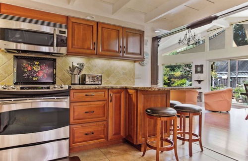 Step outside, and you'll find yourself immersed in nature's embrace. Enjoy your morning coffee in the beautiful garden, fire up the gas grill for an alfresco feast, or lose yourself in a captivating novel. The secluded outdoor space, complete with a flowing fountain, artistic statuary, and umbrella-shaded seating, is an idyllic setting for relaxation and rejuvenation.