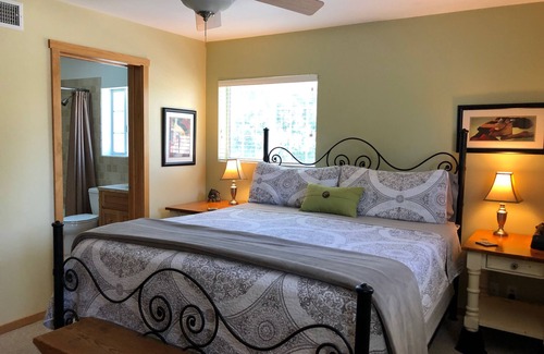 This is a two story guest house on the back of a quiet property. The owners live in the front and are available to help address any issues you may have. Guesthouse includes a kitchenette (there is no oven) and washer/dryer for your use in the attached garage. There is a master bedroom and a loft area (as second bedroom) please review all pictures. This is a fun, warm, cozy private home with access to a pool and Jacuzzi right outside your door. If your party is larger than 5 people you have access to a high quality inflatable mattress that comfortably sleeps another guest for a maximum of 8 guests. Please note that depending on the season the pool may have leaves in it. We have a dedicated pool person that comes on Tuesday but winds do kick up and blow leaves into the pool from time to time. We do our best to keep it clean, weather permitting.