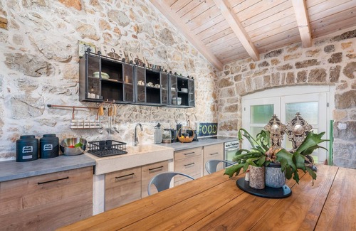 Rustic charm meets modern comfort in this inviting and spacious holiday home. Conjure up Croatian dishes in the open-plan, fully equipped kitchen and take a seat at the stylish wooden table. Immerse yourself in the cosy atmosphere of the living room, relax on the comfortable sofa with a good book that you don't find time for in everyday life, or spend time together on a games evening.