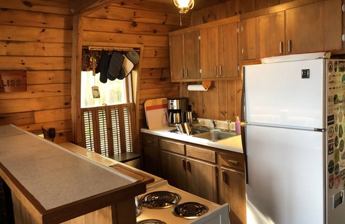 Pine Tree Chalet was hand-built by the previous owner in 1972, individually constructing the arching splines with a form of his own making. The loft has two bedrooms with bunk beds in each room, and a space our kids use for gaming, reading, or yes, watching TikTok videos.