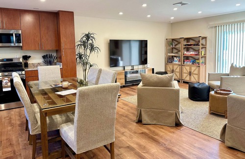 -Open concept living room includes a 75" smart TV preloaded with streaming apps, a comfortable couch and two swivel chairs