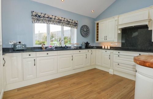 Criw consists of a kitchen/diner with electric double oven, gas hob, microwave, fridge/freezer, dishwasher, breakfast bar for four people, dining seating for twelve people, and Smart TV, a utility with washing machine, a utility, and a sitting room with Smart TV and woodburning stove. The bedrooms consist of two king-size with en-suite shower rooms, two twins, and family room with king-size and truckle, serviced by a bathroom and ground-floor shower room. You'll find a shop and pub in 1.3 miles. WiFi, fuel, power, starter pack for woodburning stove, bed linen, and towels inc. in rent. Outside, there is an enclosed garden with decking, patio, lawn, furniture, and hot tub and off-road parking for eight cars. One well-behaved dog welcome. Sorry, no smoking. Travel cot and highchair available on request. Criw offers a splendid retreat, whatever time of year. Note: Good housekeeping bond of 500 GBP. Note: Step up in ground-floor shower room, please take care. Note: The log burner is only available to use in the winter period