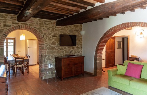 The apartment sleeps 6 people. The extensive living area, with stone walls and traditional beamed ceilings, has 2 sofas, an open fireplace and flat screen TV. A brick arch leads through to a dining room with a wooden table for 6 people and then a stylish, wooden fitted kitchen. The kitchen is well-equipped with a large cooker hob, oven, dishwasher, fridge/freezer and a Mokka coffee maker.