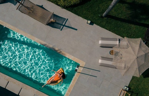 Outside, the pool terrace offers a private sanctuary. Dive into the large pool or unwind on a sun lounger under the warm Mediterranean sun. A hammock and an outdoor lounge area provide additional spots for relaxation, while the dining table is perfect for enjoying evening meals under the stars. The pool terrace, with its sea views and serene atmosphere, is the heart of the villa’s outdoor living.