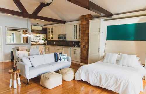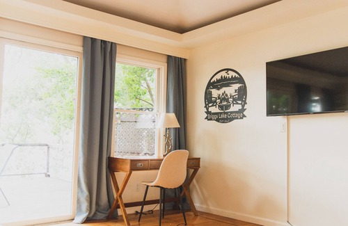 550 sq ft lakefront studio cottage with private deck to enjoy the sunset or a coffee in the morning. Comfortable Queen Murphy bed in living room with beautiful wood banisters and pull-out sofa for an additional guest. Luxuriously remodeled bathroom with heated floors, double vanity, and rain showerhead + tub. Dedicated work desk with blazing wi-fi. Full kitchen and dining table. Pull-out sofa to fit an additional guest. Professionally cleaned after every stay.