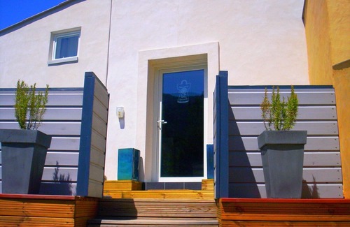 This contemporary 115-m² artist and designer villa has a 25-m² south-facing terrace overlooking the lake. Bed linen is provided. Obligatory departure cleaning to be paid at the time of your stay (90 euros). Deposit 500 euros. The lake is 50 m away, perfect to reach the beach walking! There is a pedal boat for 4-5 people at guests' disposal! For 4 people (2 bedrooms) and 2 additional people with a double bed on the mezzanine above the "cube" in the living room. Great amenities with a loft style, a large 45-m² living area with living and dining room, a reading nook, an equipped open-plan modern 9-m² kitchen with very high ceilings, and big and luminous windows opening to nature, the mountains, the sky and the clear water of Verdon Gorge. Large wooden 25-m² south-oriented terrace overlooking the lake with sun-loungers, armchairs, a dining table with chairs, sun umbrellas, and an electric barbecue. The ground floor and the garden are reserved to the two owners that are very discreet (see the reviews).