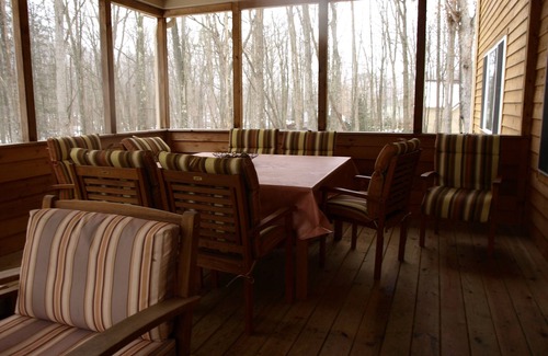 .Two steps up brings you into the !st floor where elderly or handicapped people can stay in the Queen sized bed room off the kitchen with a full bathroom around the corner.There is a screened-in porch 16x25 off the dining rm which provides an outdoor dining+family room so you can enjoy the views of mountains,stream,deer and lake thru the trees.