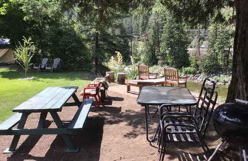 Great place in the mountains to come and enjoy the great outdoors. Savour the seasons in this tranquil setting and take advantage of all that nature has to offer! Beautiful one acre yard right on the river with a campfire and BBQ.