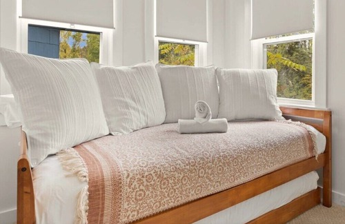 Off of the main dining room is the main bedroom, which is airy, with plenty of closet space. Boasting a cloudlike Queen bed and high ceilings, this is the perfect place to cocoon, in any weather.