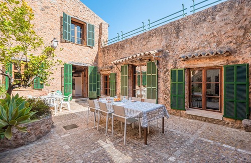 IIn the heart of the Sierra de Tramuntana, in the village of Esporles, you will find the Finca Sa Tafona de Son Quint, which offers space for up to 10 people. The house has air conditioning in 4 bedrooms and in the living room on the ground floor, 6 bedrooms with 3 bathrooms en suite, a toilet on the ground floor and a shared bathroom on the ground floor. The distribution of the bedrooms is as follows: on the ground floor: a master suite with bathroom with a further single bedroom and an office, a double bedroom with bathroom en suite and a single bedroom with bathroom en suite; in the separate upstairs flat there are two double bedrooms and a shared bathroom. Downstairs there is a spacious living room with fireplace and a superb well equipped kitchen with dining area. There is also a kitchen open to the living room in the upper flat. It is equipped with underfloor heating, Wi-Fi, high chairs, cots and parking.