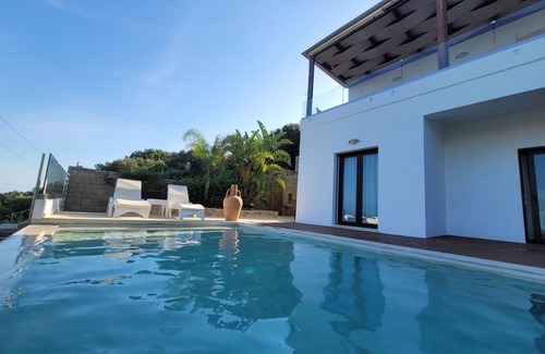 On the lower floor has a wide open exit directly adjacent to the pool. It is a few meters of wooden deck between just. It is a magnificent room, an in and out room in spa style. There is plenty of outdoor space. The patio around the pool is large and spacious and offers spectacular views of the mountains, valley and sea that characterize the entire villa. During the day, the view offers green olive fields and grape farms, villages with whitewashed stone houses, the mountain view and the wonderful blue Mediterranean. In the evening and night you see the magical starry sky as well as all the villages and Chania coast lights. When it's full moon, the moonlight lights up the place and provides a fantastic experience.