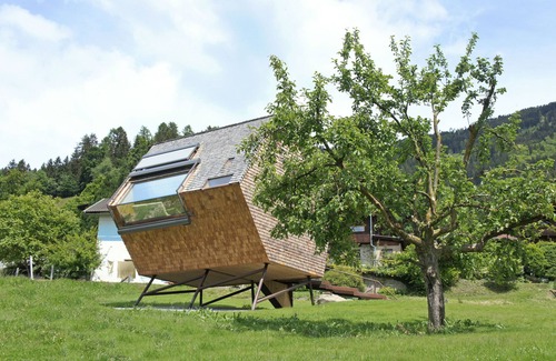 Living in a wooden sculpture: welcome to the Ufogel! This is not an off-the-shelf house, rather a living sculpture that turns out to be a miracle of space when you enter. A spacious, bridge-like access as the only connection to the seemingly floating building. When you sit, lie, take a shower or have a meal together in the Ufogel, two things are always present: the wood and the sky.