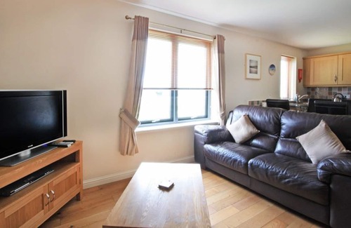 Modern well-equipped apartment in the centre of Cromarty. Opposite the Harbour and Cromarty beach and just minutes walk from the all that Cromarty has to offer. Family and dog-friendly the apartment has all rooms on the ground floor with open plan living room, kitchen and dining area. Great views over the Cromarty Firth and mountains and hills beyond from the lounge and kitchen windows. There is seating for 4 on 2 settees, TV with Freeview channels, DVD player, CD unit with radio. The dining area has seating for 4. The modern kitchen is fully equipped with electric oven and hob, fridge, freezer, washing machine dryer, toaster, kettle, microwave oven and plenty kitchenware if you choose to dine in instead of eating out in Cromarty or on the Black Isle. There are 2 bedrooms, one double room with bedside cabinets with lights, fitted wardrobe, alarm clock radio and TV. The other has 2 single beds with bedside cabinet with light, fitted wardrobe with alarm clock radio. The beds can be put together to make a double bed. The bathroom has a shower, wash hand basin and toilet. There isn't a bath I'm afraid. Outside there is ample space in the communal garden that has grass and gravel.