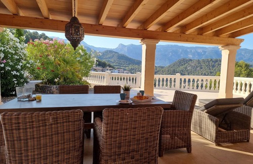 The air-conditioned "holiday house 1" is located above the town of Port de Sóller and enjoys a wonderful 180 degree panoramic view of the mountains and the bay with a sandy beach (partial view).