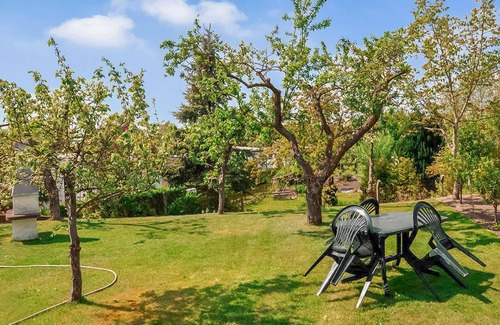 The small holiday apartment is located in the owner's house in a quiet location in a residential area on a fully fenced plot of around 1600 square metres. A bakery and shopping facilities are about 1.5 km away, the nearest restaurant is about 1 km away. The Domjüchsee lake with bathing area is about 1.5 km away. The train station is 3 km away. The apartment was newly renovated in 2021, has a separate entrance and is about 40 square metres in size. It offers space for 3 people and is equipped with a living room with couch (sofa bed), flat screen TV, radio with CD player, DVD player, sitting area and a reading corner with an extensive collection of books. The apartment also has a bedroom with double bed and an open-plan mini-kitchen with electric hob (2 hotplates), fridge with freezer compartment and a bathroom with WC, shower and hairdryer. The apartment is equipped with insect screens in front of the windows and central heating: Cot, high chair, furnished terrace with barbecue, 1 sun lounger, seating areas in the garden, storage space for bicycles, car park. Smoking is only permitted outdoors. The total price includes final cleaning, bed linen, towels, water and energy consumption.