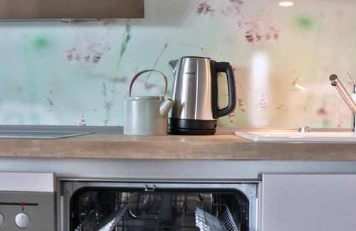 The kitchen is equipped with an oven, a refrigerator, and a dishwasher, as well as a coffee maker, an electric kettle, and a microwave. Bathroom amenities include a hair dryer and towels. Other amenities include bed sheets and heating.